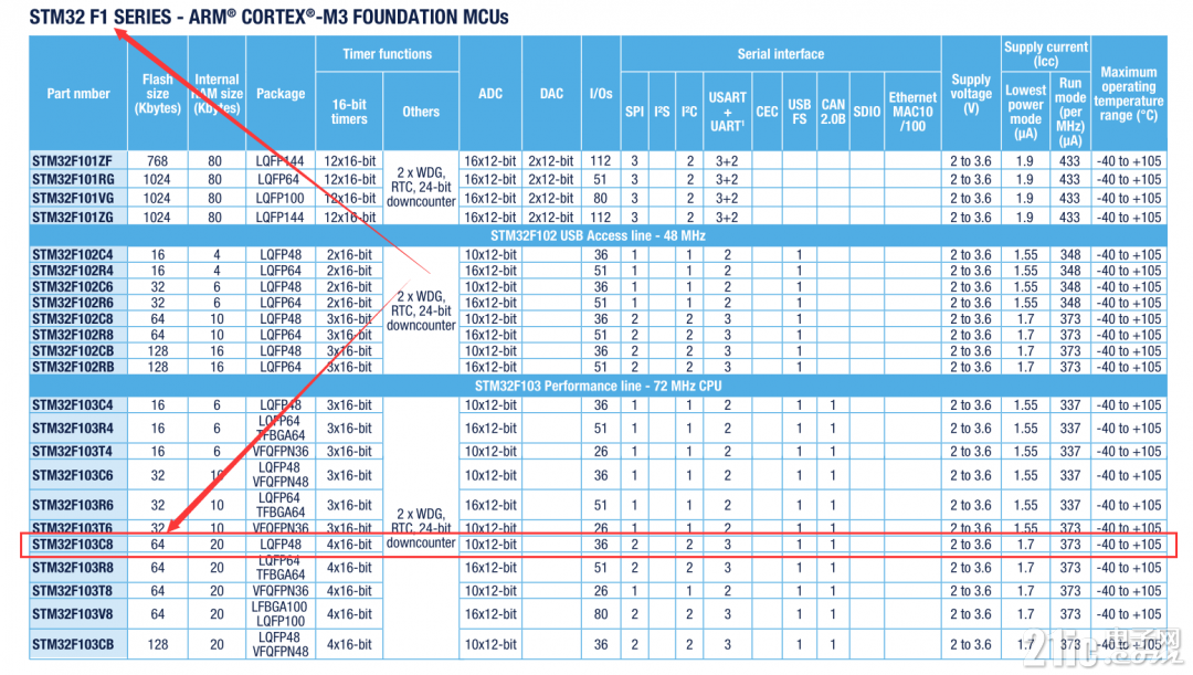 現(xiàn)在芯片的flash大小我們知道了,下面就可以看看這個(gè)flash是怎么劃分的了,通過芯片數(shù)據(jù)手冊(cè),我們能看到今天說的STM32F103C8T6是屬于中等容量的設(shè)備。
