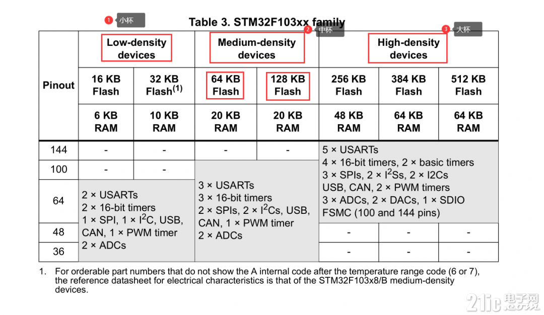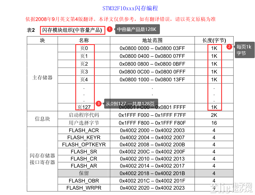既然是中等容量的設(shè)備了,那我們就來看看flash劃分吧,在STM32的閃存編程手冊(cè)中有這樣一段話:按照不同容量,存儲(chǔ)器組織成: