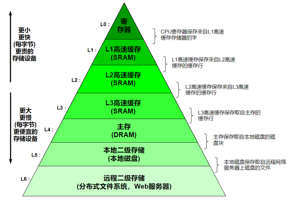 訪問memory數(shù)據(jù)的速度與core的運(yùn)行速度相比,要花費(fèi)更多的時(shí)鐘周期。為了減少這個(gè)差異計(jì)算機(jī)系統(tǒng)引進(jìn)了存儲(chǔ)器層次結(jié)構(gòu),如圖1所示。在層次結(jié)構(gòu)中,越往上,讀寫速度越快,價(jià)格越貴,存儲(chǔ)容量也越小。