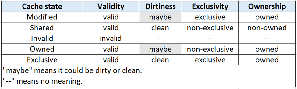 只有一個(gè)core的系統(tǒng)中,cache line的狀態(tài)要么有效要么無效。如果需要區(qū)分dirty狀態(tài),則cacheline可能有兩種有效狀態(tài)。Dirty的cache line具有比memory更新的數(shù)據(jù)。具有多個(gè)core的系統(tǒng)也可以只使用這兩三種狀態(tài),但通常需要區(qū)分不同類型的有效狀態(tài)。cache line狀態(tài)有四個(gè)主要特征:validity、dirtiness、exclusivity和ownership。后兩個(gè)特征是具有多core的系統(tǒng)所特有的。