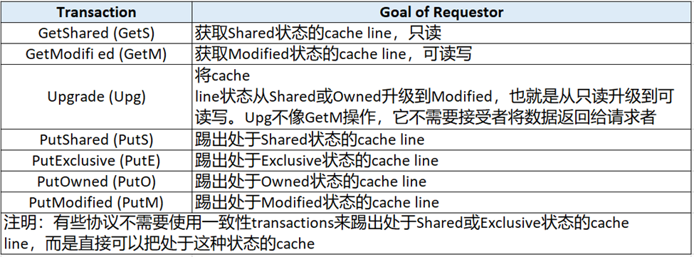 一致性控制器組件的基本目標(biāo)都是相似的,所以大多數(shù)一致性協(xié)議都有類似的transaction集合。例如,幾乎所有協(xié)議都有一個(gè)獲取Shared(只讀) cache line的transaction。表2列出了一組常見的transactions,并且對于每個(gè)transaction,描述發(fā)起transaction的請求者目標(biāo)。這些transactions都是由cache控制器發(fā)起的,這些cache控制器響應(yīng)來自其對應(yīng)core的讀寫請求。表3列出了一個(gè)core可以像其cache控制器發(fā)出的讀寫請求,以及這些core請求如何引導(dǎo)cache控制器發(fā)起一致性transactions。