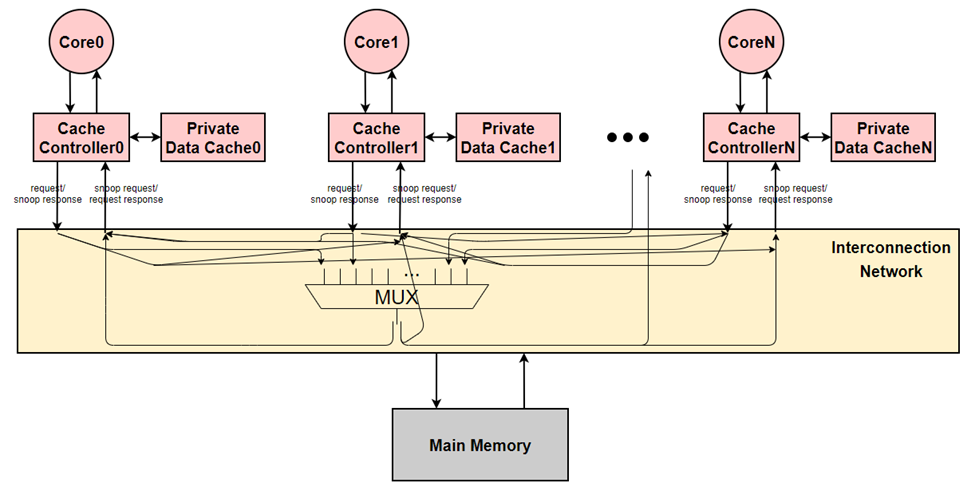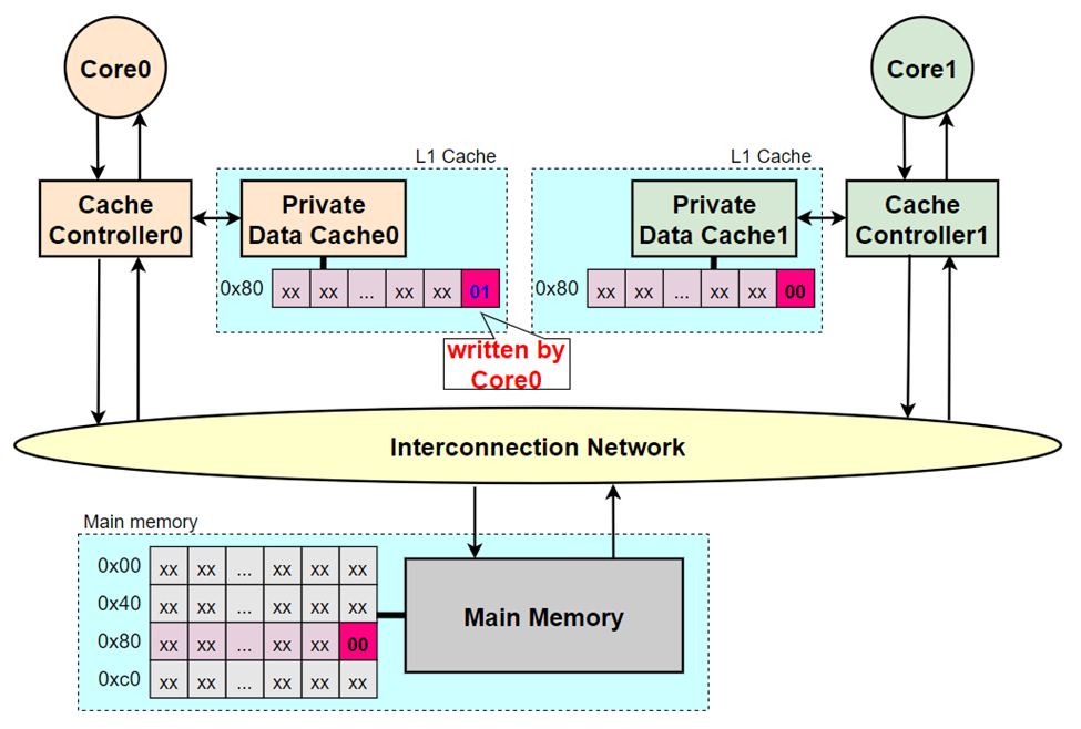 隨著摩爾定律的發(fā)展,人們試圖增加CPU的core數(shù)以提升系統(tǒng)整體性能,這類系統(tǒng)稱之為多core系統(tǒng)。一個(gè)包含多core的系統(tǒng)中,每個(gè)core可能都有自己的私有cache,并且有可能會(huì)對相同的memory地址進(jìn)行修改。如果多個(gè)core同時(shí)對同一memory地址進(jìn)行讀寫操作,很可能導(dǎo)致cache內(nèi)容不一致,從而導(dǎo)致數(shù)據(jù)不一致,最終造成系統(tǒng)出錯(cuò)和崩潰。因此,在設(shè)計(jì)多core系統(tǒng)時(shí),必須考慮cache一致性(cache coherency)問題來確保數(shù)據(jù)的正確性和系統(tǒng)的穩(wěn)定性。舉個(gè)例子,假設(shè)2個(gè)core的系統(tǒng),每個(gè)core私有的L1 cache的cacheline大小是64Bytes。兩個(gè)core都讀取0x80地址數(shù)據(jù),導(dǎo)致0x80開始的64Bytes數(shù)據(jù)都分別加載到core0和core1的私有L1 cache中。