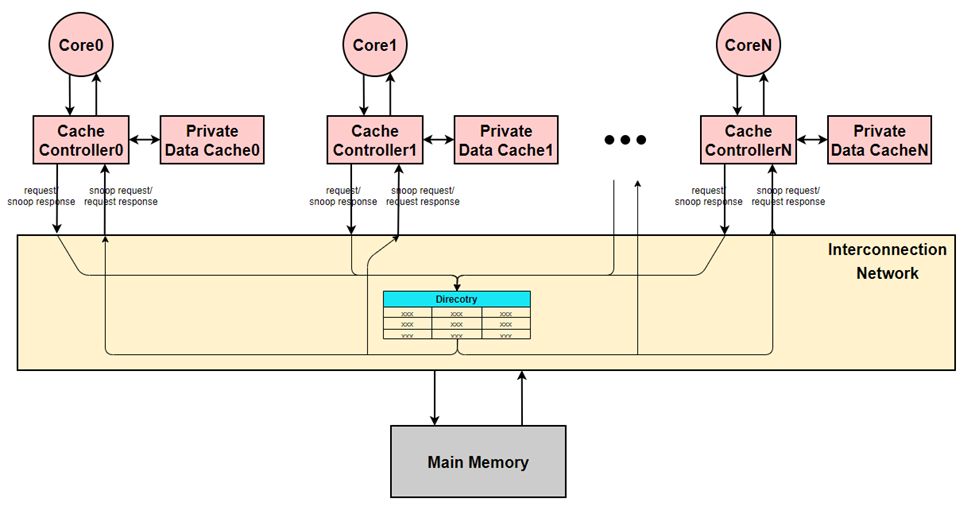 目錄協(xié)議最初是為了解決監(jiān)聽協(xié)議缺乏可擴(kuò)展性的問題而開發(fā)的。目錄協(xié)議會(huì)創(chuàng)建一個(gè)目錄來維護(hù)每一個(gè)cacheline的一致性狀態(tài)的全局視圖。該目錄跟蹤各cache保存了哪些cacheline以及處于什么狀態(tài)。Cache控制器發(fā)出的一致性請求將直接單播給目錄控制器(通常也稱作home)。目錄控制器要么直接響應(yīng)請求,要么根據(jù)目錄信息將請求轉(zhuǎn)發(fā)給一個(gè)或多個(gè)其它c(diǎn)ache控制器,然后由后者響應(yīng)。目錄協(xié)議使用間接層來避免有序廣播網(wǎng)絡(luò)和讓每個(gè)cache控制器處理每個(gè)請求。一致性請求傳輸流程通常包括兩個(gè)步驟(單播請求,然后是單播響應(yīng))或三個(gè)步驟(1個(gè)單播請求,K個(gè)轉(zhuǎn)發(fā)請求和K個(gè)響應(yīng),其中K是共享者的數(shù)量)。有些協(xié)議甚至還有第四部,因?yàn)轫憫?yīng)間接通過目錄控制器,或者因?yàn)檎埱笳咴谝恢滦粤鞒掏瓿蓵r(shí)通知目錄控制器。相比之下,監(jiān)聽協(xié)議將一個(gè)cacheline的狀態(tài)分布在所有cache控制器上,由于這種分布式狀態(tài)沒有中央單元記錄信息,一致性請求必須被廣播到所有cache控制器上。因此監(jiān)聽協(xié)議的一致性請求流程總需要兩個(gè)步驟(廣播請求,然后是單播響應(yīng))。
