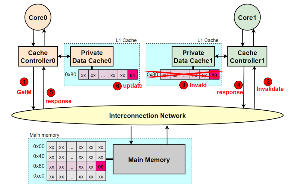Core0修改0x80地址數(shù)據(jù)的時(shí)候,除了更新core0的私有cache之外,還應(yīng)通知core1的私有cache將0x80地址所在的cacheline置為無效。保證core1讀取數(shù)據(jù)時(shí)不會(huì)命中自己的cache。這樣core1就必須重新從core0或memory中去讀取0x80地址最新的數(shù)據(jù)。