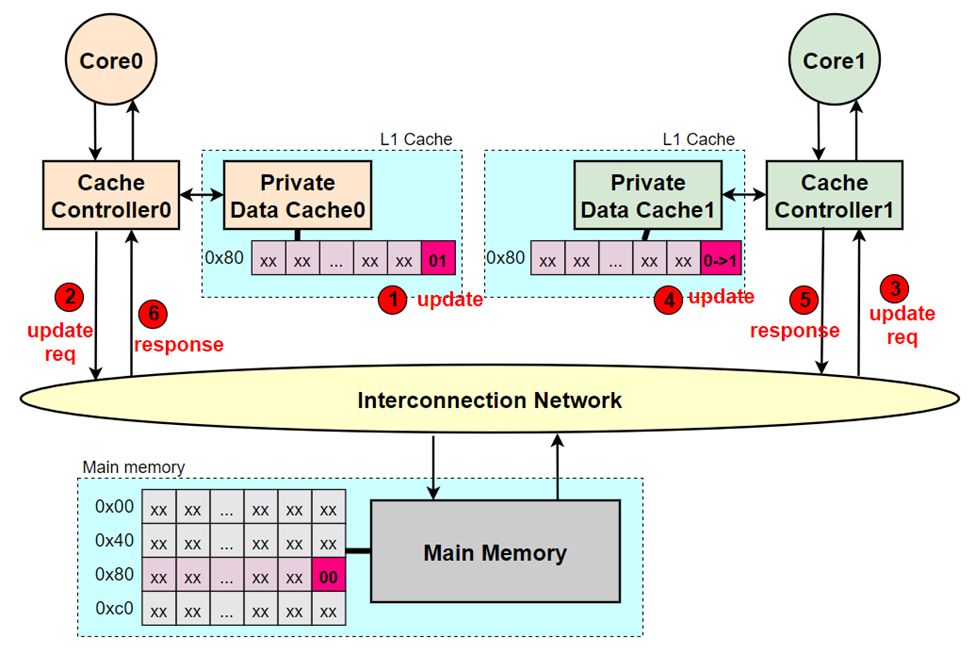 當(dāng)一個(gè)core需要往某cacheline寫入一個(gè)值時(shí),它會(huì)啟動(dòng)一個(gè)一致性請求來更新所有其它c(diǎn)ache中的副本,這樣所有cache用到的都是新值。