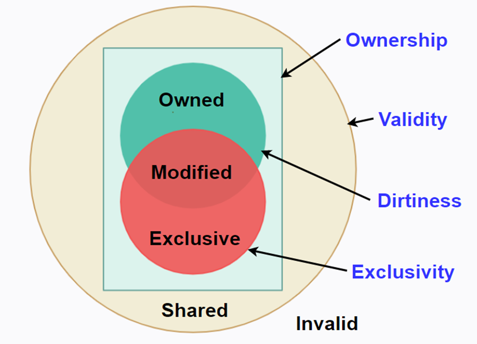圖9用Venn圖展示了MOESI狀態(tài)。Venn圖可以展示哪些狀態(tài)共有哪些特征。除了I之外的所有狀態(tài)都有效。M、O和E是ownership狀態(tài)。M和E都是exclusivity,因?yàn)闆]有其它c(diǎn)ache擁有該line的有效副本。M和O都是表示該cache line可能是dirty的。M、O、E和S組成了V(alid)態(tài)。