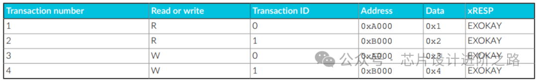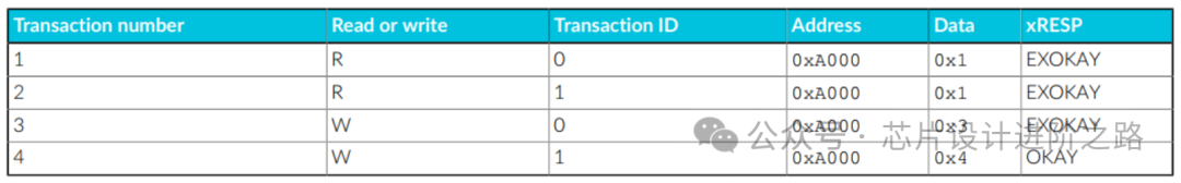 從屬接口包括可以為每個事務(wù)保存訪問的ID和地址的獨(dú)占訪問監(jiān)控硬件。下表描述了示例序列中的不同事務(wù)。表中的所有事務(wù)都是獨(dú)占訪問:
