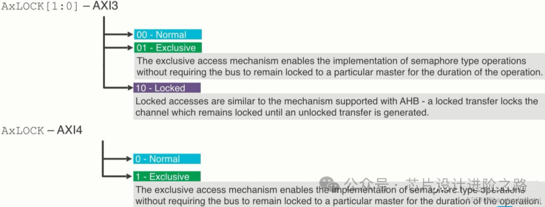 Exclusive訪問通過AxLOCK信號和響應(yīng)信號(RRESP和BRESP)來實(shí)現(xiàn),其中EXOKAY表示獨(dú)占訪問成功,而OKAY則表示獨(dú)占訪問失敗。
