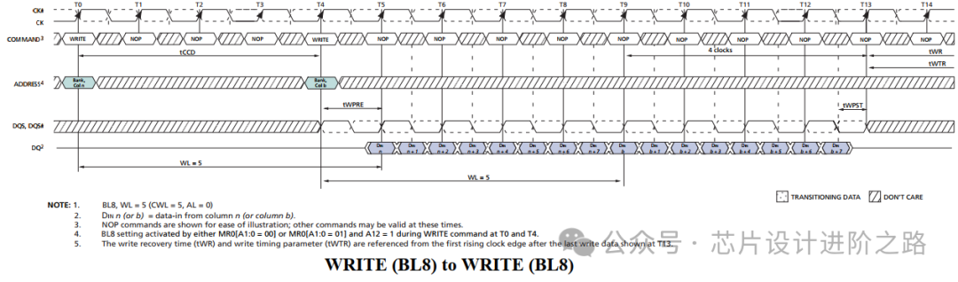 如果在寫操作期間接收到其他命令(如REFRESH, PRECHARGE),必須根據(jù)命令優(yōu)先級和時序要求進行處理。