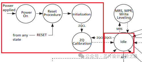 DDR3 SDRAM從上電到進入空閑狀態(tài)的過程中,經(jīng)歷了一系列初始化步驟,包括上電、復位、初始化、ZQ校準和空閑狀態(tài)。
