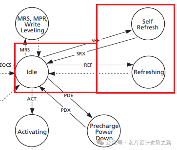 進入自刷新模式需要通過特定的命令序列,包括預充電所有Bank、設置自刷新命令(SRE)等。