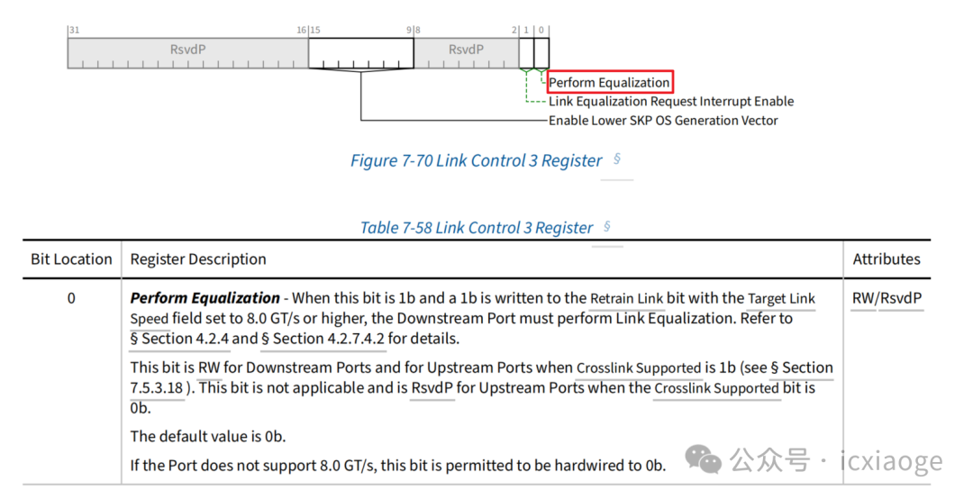 1.將Secondary PCI Express Extended Capability中的Link Control 3 Register中Perform Equalization字段寫1,此操作是為了保證重新建鏈過(guò)程中執(zhí)行Equalization操作,Perform Equalization字段默認(rèn)值為0,且每次重新建鏈后此字段會(huì)被清零。