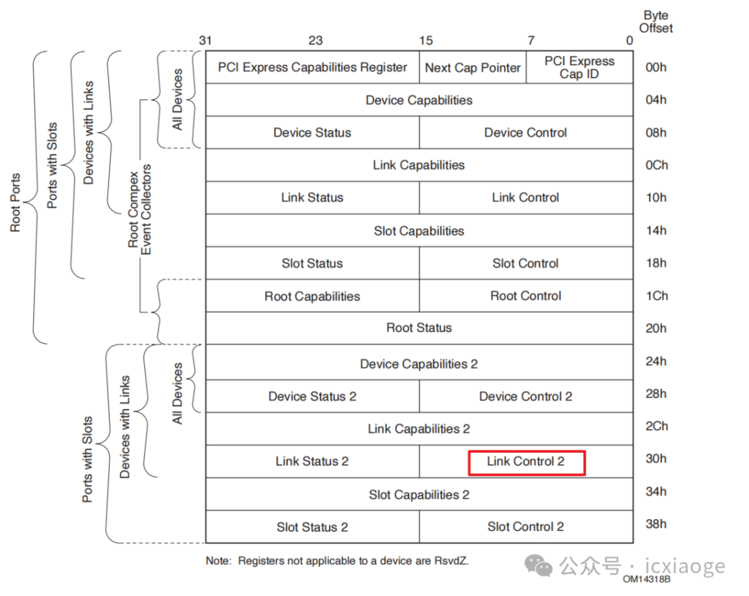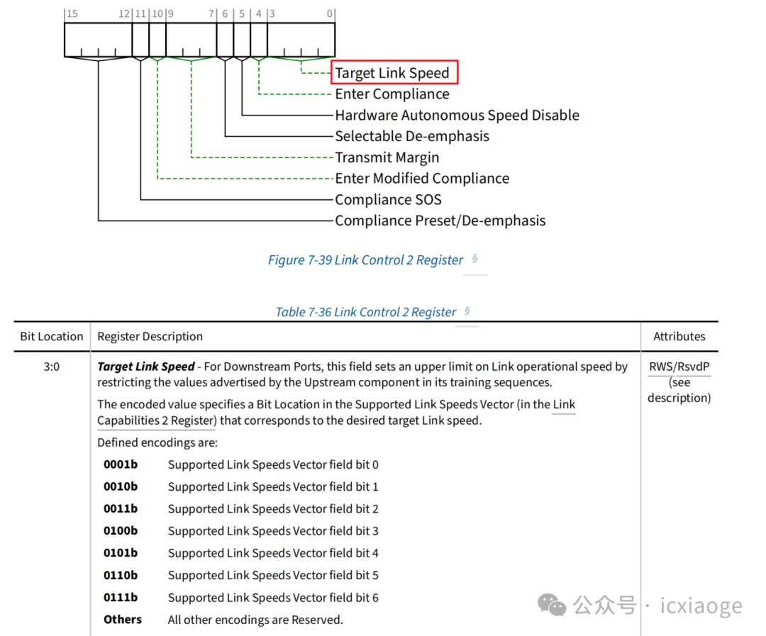 2.設(shè)置目標(biāo)速率:將PCI Express Capability Structure中的Link Control 2 Register的target Link Speed設(shè)置成目標(biāo)速率,字段表示設(shè)備支持的最大速率