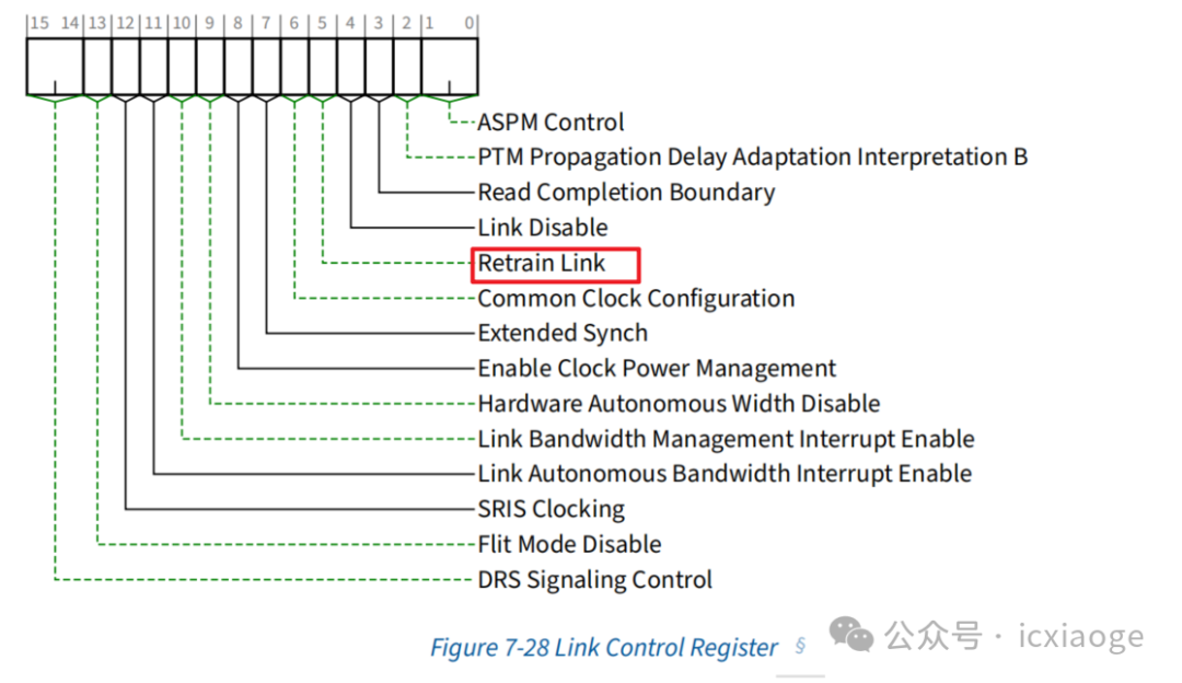 3.將PCI Express Capability Structure中的Link Control Register的Retrain Link字段寫1,pcie鏈路將進(jìn)行retrain操作。