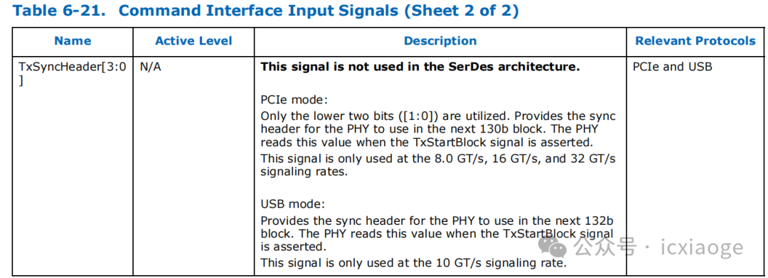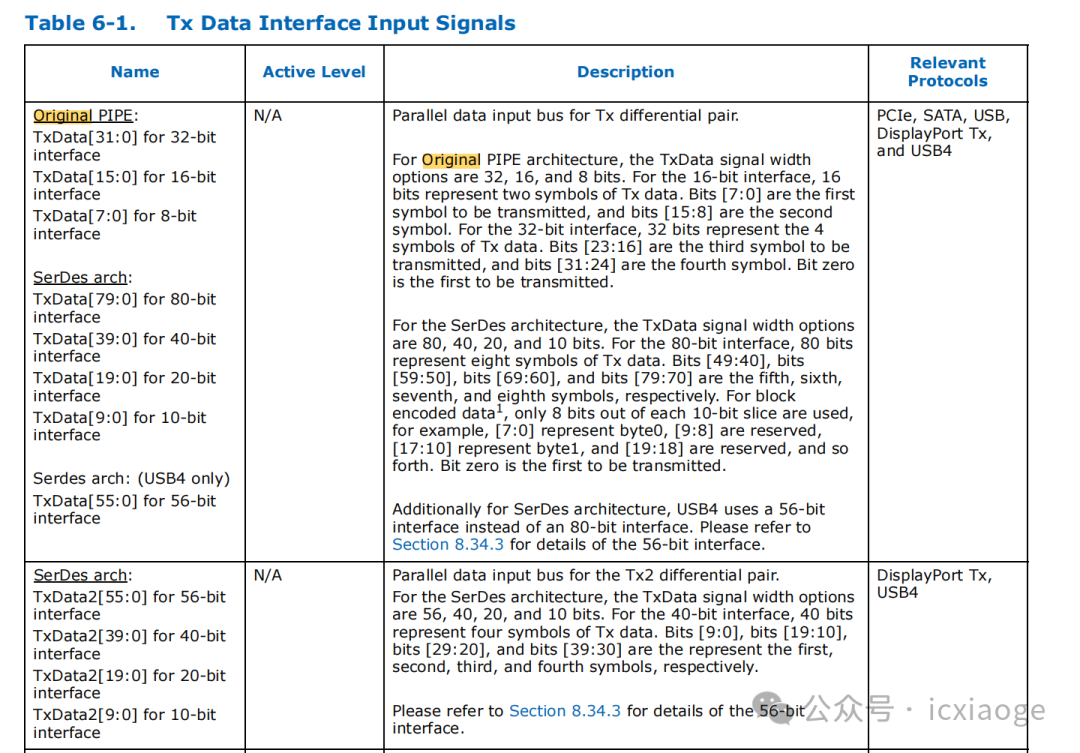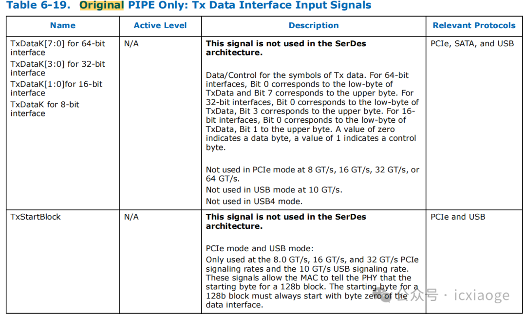 如圖所示,TxData信號(hào),在original PIPE架構(gòu)中,其信號(hào)位寬是8bits/16bits/32bits,這是完成8b/10b or 128b/130b encode前的數(shù)據(jù)位寬。而在serdes PIPE架構(gòu)中,其信號(hào)位寬是10bits/20bits/40bits/80bits,這是完成8b/10b or 128b/130b encode后的數(shù)據(jù)位寬。