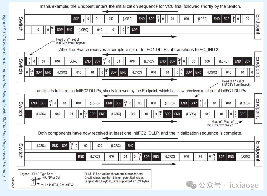 為了保證InitFC1 DLLP能夠得到足夠的傳輸頻率,此時(shí)數(shù)據(jù)鏈路層會(huì)阻塞其他類(lèi)型的傳輸,例如阻塞Ordered Sets), Ack and Nak DLLPs (when applicable), 以及其他VC的TLP