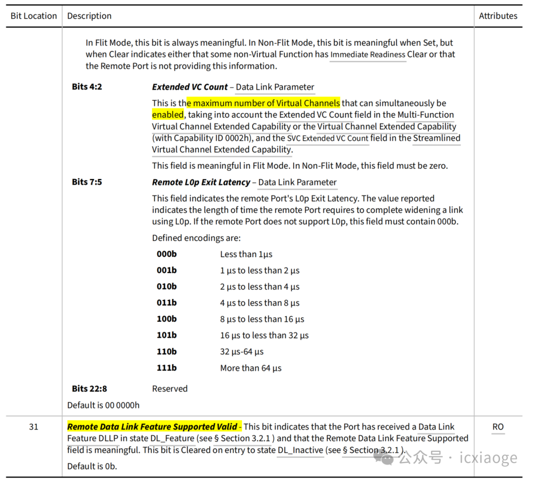 ? 支持16.0 GT/s以及更高速率的port必須支持 Data Link Feature交換協(xié)議。實(shí)現(xiàn)此協(xié)議的Downstream Ports必須實(shí)現(xiàn)了Data Link Feature Extended Capability,而實(shí)現(xiàn)此協(xié)議的 Upstream Ports是可選擇實(shí)現(xiàn)Data Link Feature Extended Capability。