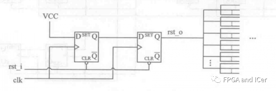 圖中的復(fù)位電路首先用兩級(jí)寄存器對(duì)復(fù)位進(jìn)行同步,得到根復(fù)位信號(hào)后再對(duì)其用復(fù)位同步器進(jìn)行分發(fā)。由于同步后的根復(fù)位信號(hào)不會(huì)帶來亞穩(wěn)態(tài)的問題,因此,在分發(fā)根復(fù)位信號(hào)時(shí)再次使用兩級(jí)寄存器對(duì)根復(fù)位信號(hào)進(jìn)行同步和分發(fā)是很安全的。