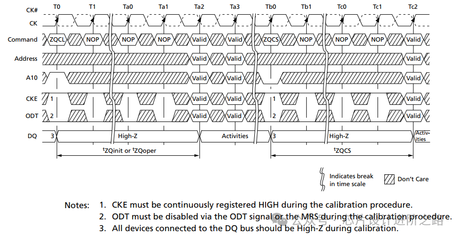 ZQCL (ZQ Calibration Long): 長校準(zhǔn)操作,通常在上電初始化或系統(tǒng)復(fù)位后進(jìn)行,持續(xù)時間較長,確保阻抗匹配的準(zhǔn)確性。