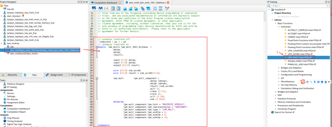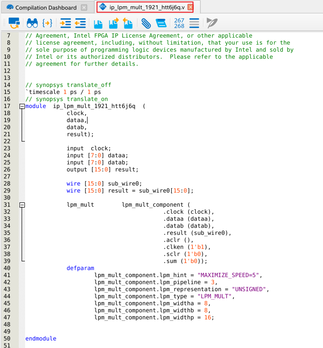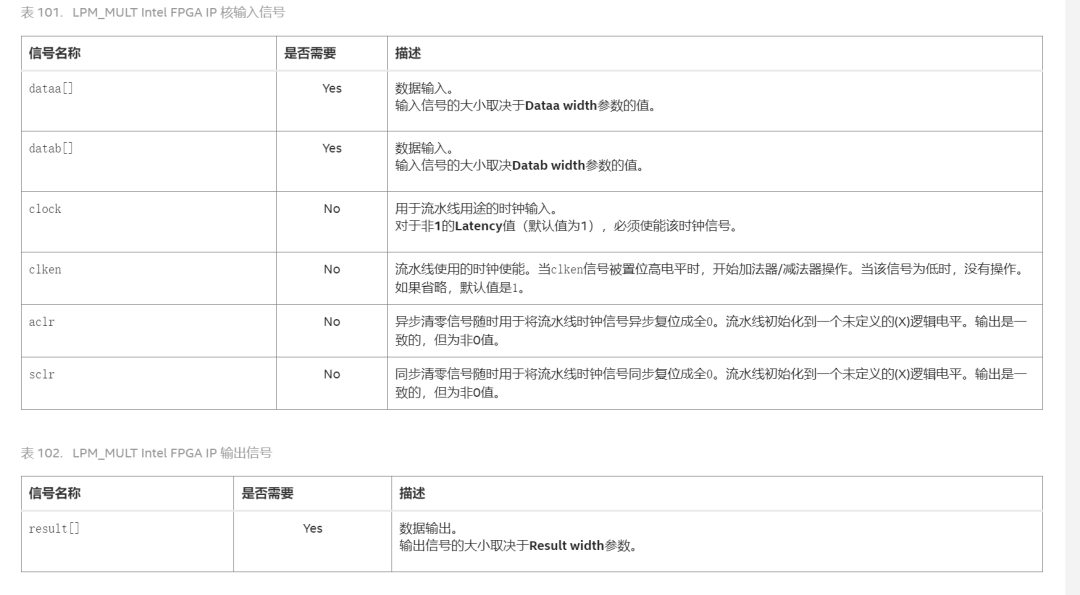 參考quartus工具給出的lpm_mult調(diào)用方法,參數(shù)化調(diào)用IP。