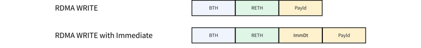 RDMA WRITE報(bào)文格式包含BTH、RETH和Payld。RDMA WRITE with Immediate報(bào)文格式包含BTH、RETH、Immediate 和Payld。Base Transport Header(BTH)即報(bào)文傳輸頭,RDMA Extended Transport Header (RETH) 即報(bào)文擴(kuò)展傳輸頭。ImmDt即Immediate Data。
