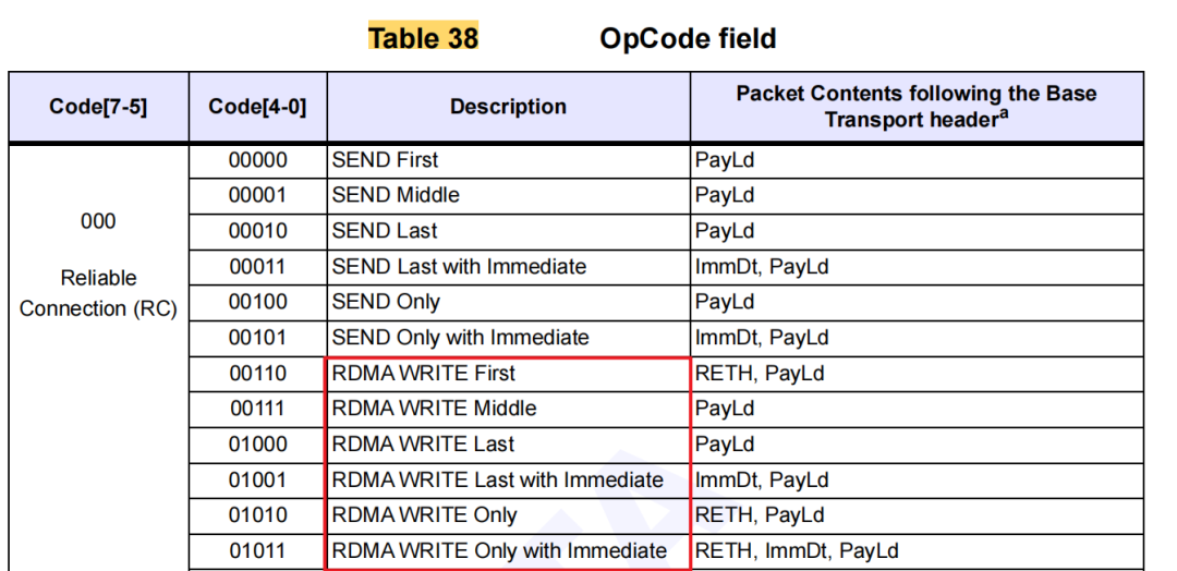 在BTH中,OpCode 即操作碼表示了報(bào)文的類(lèi)型,其含義如如Table 38 所示。紅框?yàn)镽C RDMA WRITE支持的操作碼。