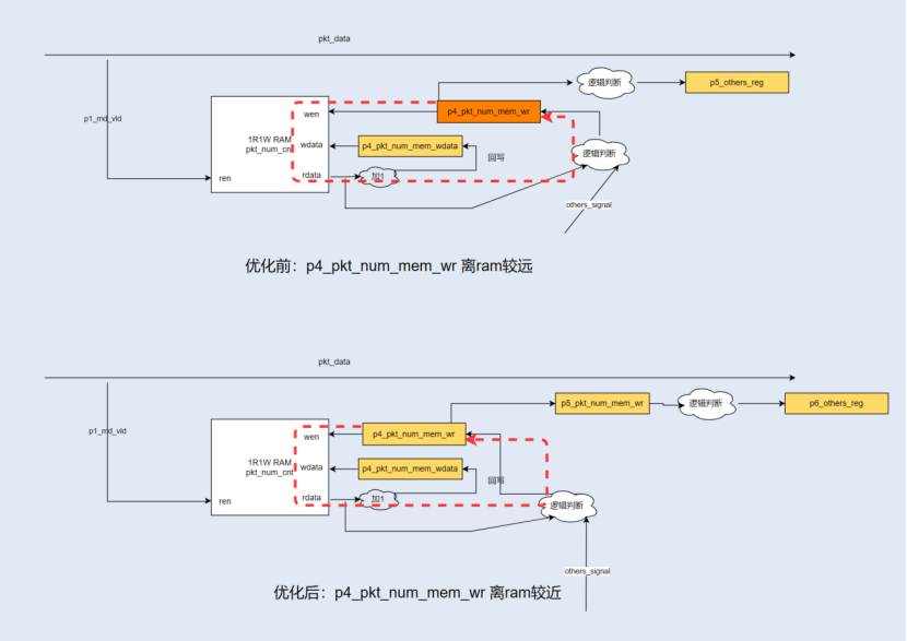 如圖所示,圖中的1R1W的RAM作為有效包數(shù)量統(tǒng)計(jì)的RAM,當(dāng)有數(shù)據(jù)包來臨時(shí)p1_md_vld為1,從RAM讀數(shù)據(jù),經(jīng)過2拍延時(shí)后得到了讀數(shù)據(jù),讀數(shù)據(jù)加1得到打一拍得到p4_pkt_num_mem_wdata,同時(shí)mem寫信號(hào)p4_pkt_num_mem_wr需要根據(jù)讀數(shù)據(jù)和其他信號(hào)進(jìn)行邏輯判斷后才能得到,因?yàn)樾枰С直晨勘辰y(tǒng)計(jì)累加,因此RAM的mem寫信號(hào)wen到讀數(shù)據(jù)rdata之間存在組合邏輯,在本案例中關(guān)鍵路徑是紅色虛線表示的路徑:p4_pkt_num_mem_wr->mem的rdata->邏輯判斷->p4_pkt_num_mem_wr。