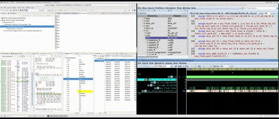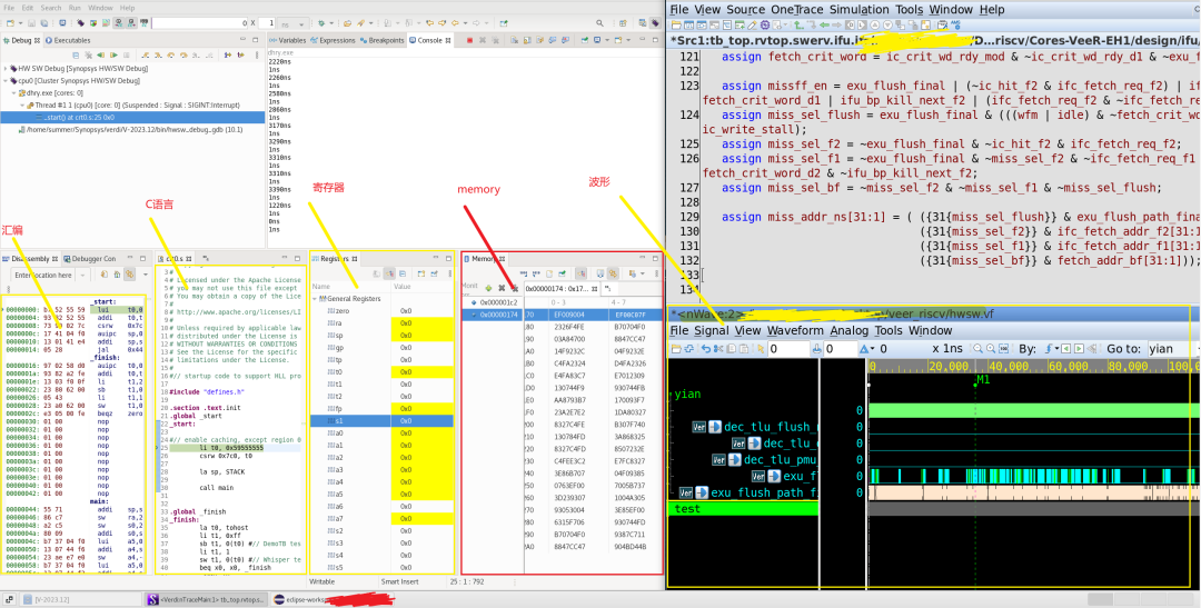 左邊是eclipse,分別展現(xiàn)匯編(包含pc,opcode等),C語言,通用寄存器,memory等信息。右側(cè)是Verdi展示的硬件執(zhí)行波形。