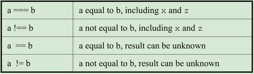 ==和!=結(jié)果可能會(huì)有x態(tài)或z態(tài)。該符號(hào)是不比較x或z的,一旦rhs或lhs出現(xiàn)x或z,那么比較的最終結(jié)果就是x。在沒(méi)有x或z之后,兩邊相等則結(jié)果1,兩邊不相等則結(jié)果為0.