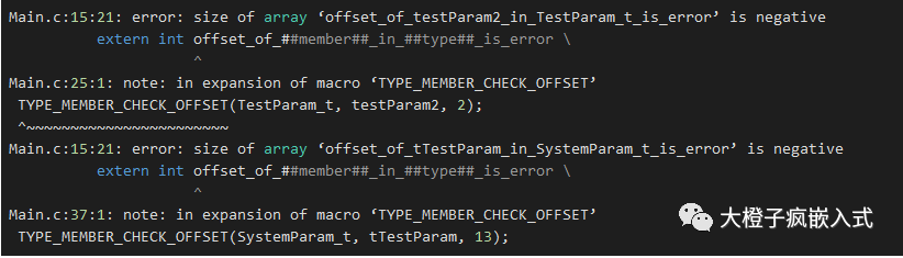 編譯時則報錯:(通過offset_of_testParam2_in_TestParam_t_is_error就能定位是哪個結(jié)構(gòu)體的哪個成員變量偏移位置不對了):