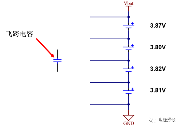 ? ? ? ?舉例來說,如圖10所示,當(dāng)最上面的電池電壓是最高時,比如3.87V,當(dāng)飛跨電容接到上面時,電容電壓被充電到3.87V,
