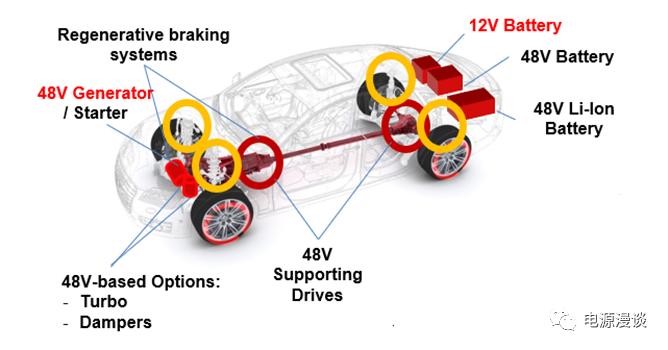 ? ? ? ? 如下圖15,是在HEV或者PHEV車上廣泛存在的48V總線結(jié)構(gòu),由于車輛電氣化的逐步發(fā)展,越來越多大功率電氣化設(shè)備的增加,原有12V鉛酸電池的總線電流會(huì)達(dá)到幾百安培,增加48V鋰電池電池后,采用48V總線供電,則大大減小了總線電流,線損會(huì)減小為十六分之一。同時(shí)由于48V電池的儲(chǔ)能效應(yīng),在剎車時(shí),可以將動(dòng)能能量存儲(chǔ)在48V電池中,再次啟動(dòng)時(shí),會(huì)更容易啟動(dòng),在節(jié)能上也有一定的幫助。