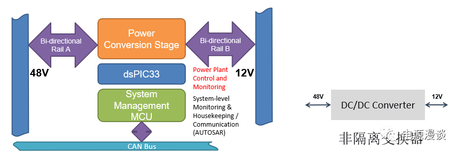 ? ? ? ? 通過一個(gè)同步整流Buck電路,將48V電池能量轉(zhuǎn)移到12V鉛酸負(fù)載,而從12V鉛酸電池的能量可以反向以Boost電路運(yùn)行,將能量轉(zhuǎn)到48V電池,通過dsPIC33來作為主控制器,可以很容易對(duì)48V和12V之間的buck DC/DC做雙向運(yùn)行,作如圖16所示。