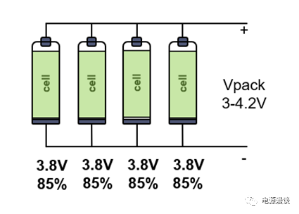 ? ? ? ? 電池組合的另一種方式,就是電池并聯(lián),電池并聯(lián)的情況會(huì)簡(jiǎn)單一些。如圖17所示,正常情況下,并聯(lián)的四個(gè)電池,其充電或者放電電壓必然是相同的,而充電或者放電電流也基本相同。