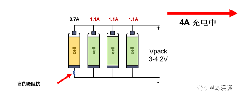 ? ? ? ? 在如下圖18所示的并聯(lián)電池充電過程中,容量偏小的電池,如最左側(cè)的一個(gè),由于其阻抗較大,所以,其獲得的充電電流會(huì)偏小,其減小的充電電流部分會(huì)被其它阻抗較小的電池所分擔(dān),所以容量較小的電池充電相對(duì)較慢,必然不會(huì)出現(xiàn)過壓?jiǎn)栴}。