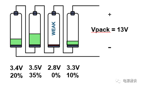 ? ? ? ? 對(duì)于一些低成本電池組,并不會(huì)對(duì)每一節(jié)電池電壓進(jìn)行實(shí)時(shí)監(jiān)控,所以,當(dāng)產(chǎn)生最弱電池電壓變負(fù)后,就會(huì)發(fā)生不可逆轉(zhuǎn)的失效或者事故。而具有單節(jié)電池保護(hù)電路的電池可以將最弱電池變?yōu)殚_路,以此阻止繼續(xù)放電,從而避免安全事故,但這并非是一個(gè)高效的處理方式,接下來我們解釋一下這一點(diǎn)。