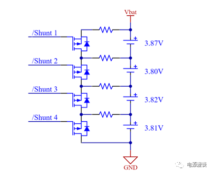 ? ? ? ? 這種方式的好處是成本較低,容易實(shí)現(xiàn),其缺點(diǎn)是部分充電能量會(huì)被當(dāng)做熱能在分流器電阻上耗散掉,所以一般的建議,將電阻和晶體管放置在相對(duì)遠(yuǎn)離電池空間處,以免熱耗散會(huì)加劇電池不平衡的狀態(tài)。