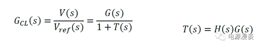 對(duì)圖1所示的框圖進(jìn)行關(guān)系推導(dǎo),即可得到輸入Vref(s)對(duì)輸出V(s)的閉環(huán)傳遞函數(shù)關(guān)系,如圖2所示。這里T(s)就是這個(gè)系統(tǒng)的開環(huán)傳遞函數(shù),它由這個(gè)系統(tǒng)所有環(huán)節(jié)的增益的乘積組成。