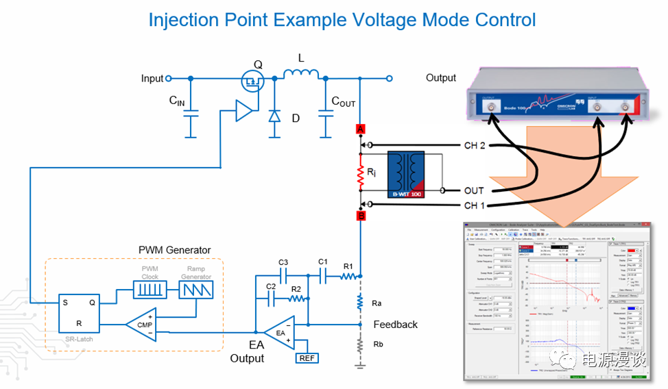 除了進(jìn)行整個(gè)環(huán)路的開環(huán)增益伯德圖測(cè)試,我們有時(shí)候還需要對(duì)功率級(jí)伯德圖進(jìn)行測(cè)試,一方面可以了解功率級(jí)這個(gè)被控對(duì)象的小信號(hào)環(huán)路特性,同時(shí)還能基于此進(jìn)行更精確的補(bǔ)償器設(shè)計(jì),而避免了其它方式進(jìn)行補(bǔ)償器設(shè)計(jì)時(shí),未考慮到一些非理想因素導(dǎo)致的誤差。