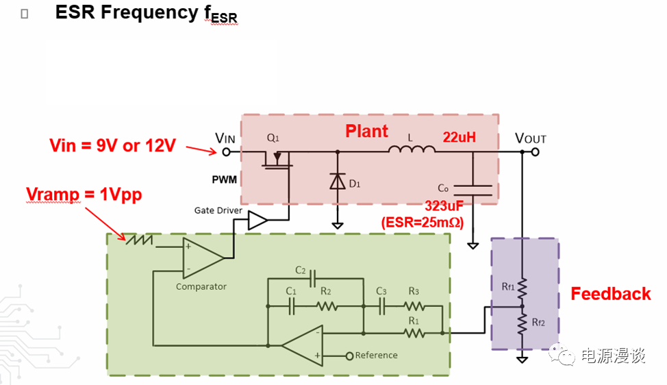 從典型電壓模式的buck電路的組成來看,它由功率級(jí)電路和控制補(bǔ)償器部分,輸出分壓反饋部分組成,這里我們同樣將PWM產(chǎn)生環(huán)節(jié)在測(cè)試時(shí),歸到功率級(jí)部分(在圖8中,對(duì)應(yīng)于EA輸出和三角波比較產(chǎn)生占空比信號(hào)部分)。從如圖8看到,功率級(jí)環(huán)節(jié)主要由開關(guān)管,輸出電感L,輸出電容C等組成,電感包含ESL(串聯(lián)電阻),電容包含ESR(串聯(lián)電阻),這些參數(shù)我們都可以在其規(guī)格書上得到,方便和伯德圖測(cè)試結(jié)果進(jìn)行相互驗(yàn)證。