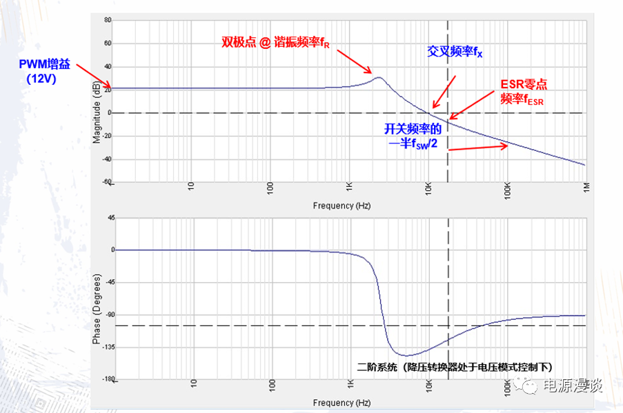 從圖9上,我們給出了一個(gè)buck電路在電壓模式控制下的波德圖,我們可以知道,在低頻下有一個(gè)低頻增益,其中由L和C形成的雙極點(diǎn)會(huì)讓相位下降180C,而增益會(huì)以40db/十倍頻下降,而輸出電容的ESR和輸出電容會(huì)在高頻段產(chǎn)生一個(gè)零點(diǎn)。后續(xù)我們會(huì)詳細(xì)分析。