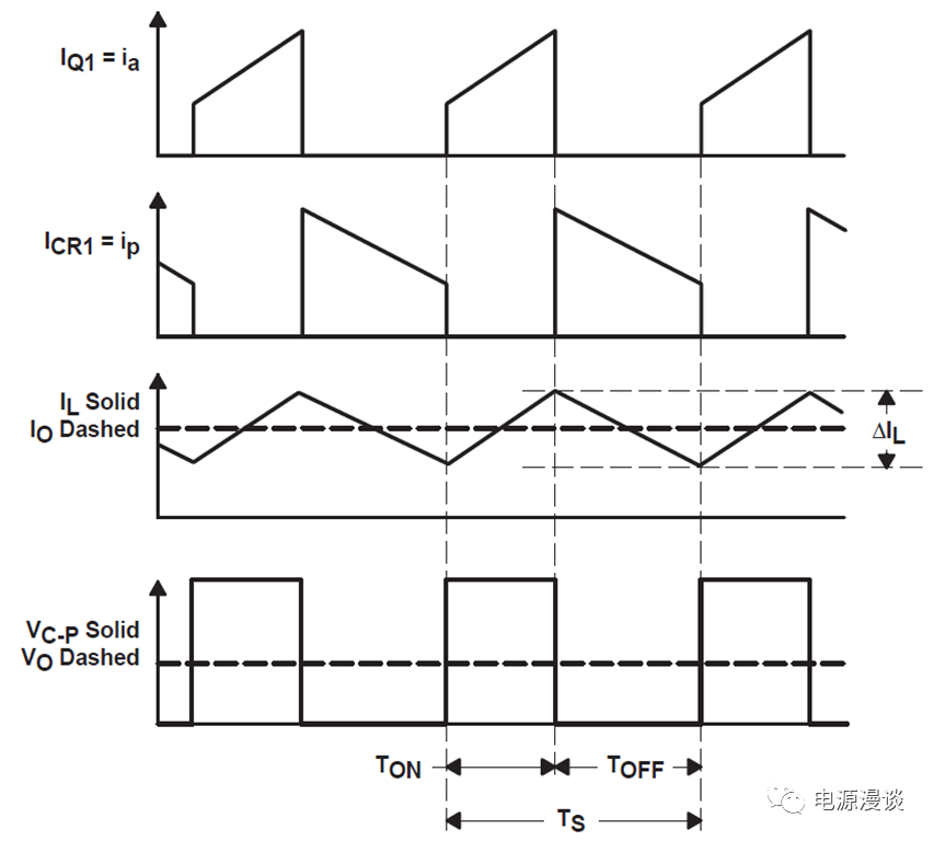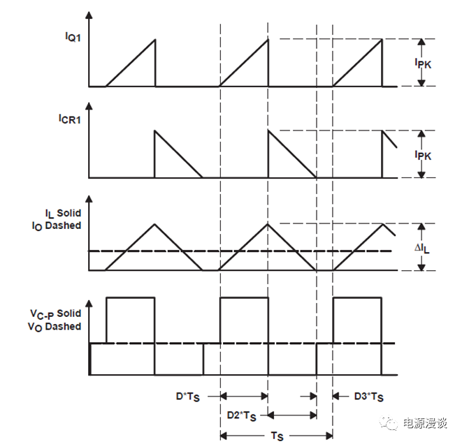 由于電感處在CCM工作模式,因此它的狀態(tài)只有這兩種狀態(tài),下一個(gè)開(kāi)關(guān)周期起始時(shí),電流從上一周期續(xù)流電流的終點(diǎn)值開(kāi)始上升。當(dāng)電路處于穩(wěn)定狀態(tài)時(shí),起始電流和上一周周期結(jié)束電流一定相同,否則一旦電流出現(xiàn)凈增加,則周而復(fù)始后電感會(huì)飽和,就不是穩(wěn)定狀態(tài)。