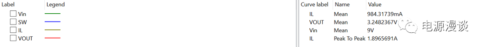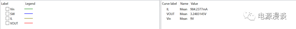 進(jìn)行瞬態(tài)仿真,我們從1mS處開(kāi)始采樣輸出數(shù)據(jù),可以準(zhǔn)確測(cè)量平均值數(shù)據(jù),從圖16上可以看到,電感電流的平均值為1A左右,p-p值為435mA,輸出電壓平均值為3.25V左右(線路壓降導(dǎo)致的輸出電壓稍低于3.3V),由于輸出電流平均值大于p-p值的一半,所以一定是在CCM模式下。