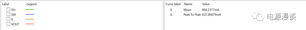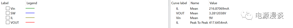 進(jìn)行POP穩(wěn)定點(diǎn)仿真,由于減小了輸出電流到218mA,則在電路設(shè)置電感的條件下,輸出電感電流為臨界模式狀態(tài),可以看到電流從0開(kāi)始上升,周期結(jié)束后最后又截止在0,由于輸出電容ESR較大,因此輸出電容的紋波電壓正比于電感電流,為三角波形狀。