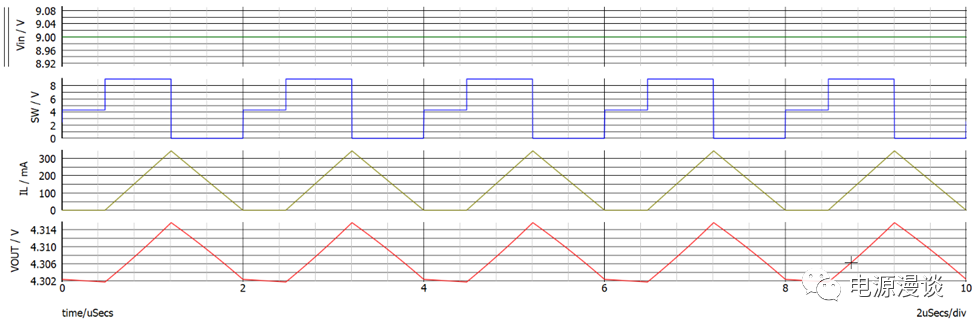 從上圖來(lái)看,每一個(gè)周期開(kāi)始時(shí)主管Q1的電流從0開(kāi)始線性上升,在開(kāi)關(guān)關(guān)斷狀態(tài)時(shí),續(xù)流管電流降到0,之后有一段保持為0的時(shí)間,D3*Ts,在這段時(shí)間內(nèi),由于電感電流變化率為0,所以電感上電壓為0,則開(kāi)關(guān)節(jié)點(diǎn)電壓等于輸出電壓。