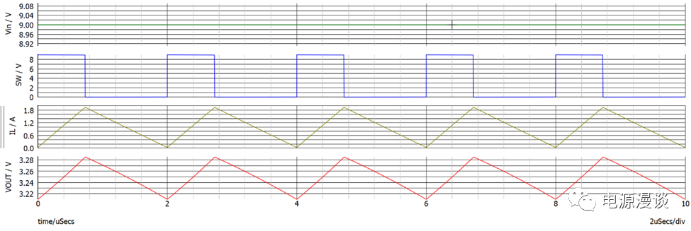 通過(guò)圖15的驅(qū)動(dòng)脈沖設(shè)置,我們得到36.6%的占空比,按照9V的輸入電壓,理想輸出電壓為3.3V.