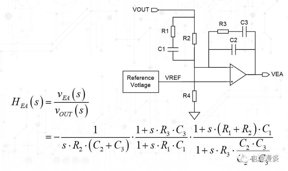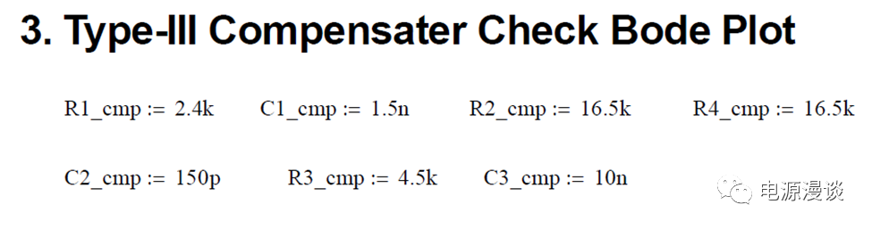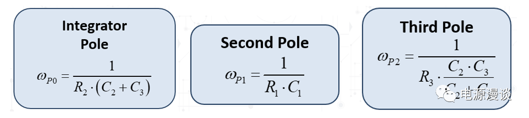 在這個三型補償器中,每一個零點和極點都由具體的電阻電容參數(shù)決定,通過設(shè)定電阻和電容的參數(shù),就可以得到零極點的頻率,或者根據(jù)系統(tǒng)所需要的零極點頻率可以去選擇需要的電阻電容參數(shù)。