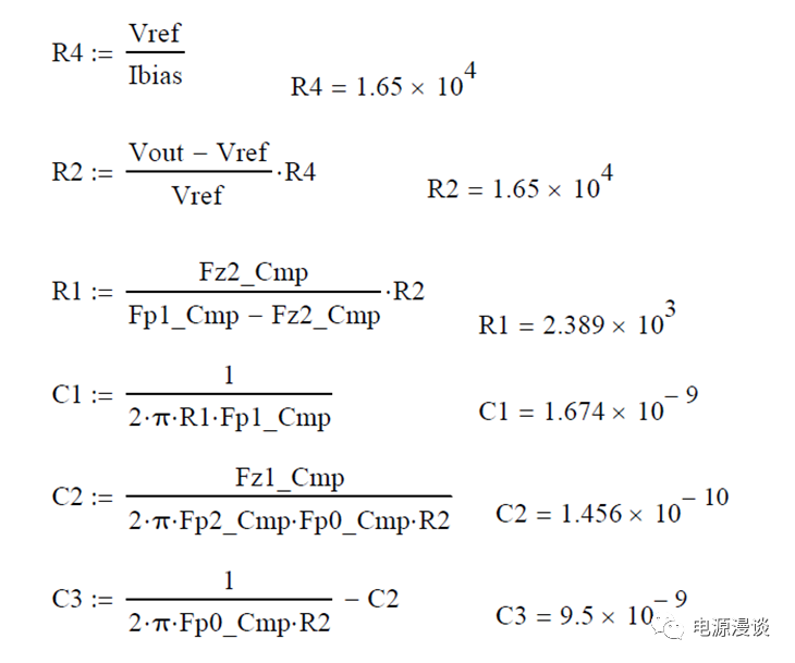 根據(jù)分壓電阻漏電流小于100uA的要求,我們計算出分壓電阻R4作為物理參數(shù)計算的起始點,逐步求出其它三型補償器的阻容參數(shù)。