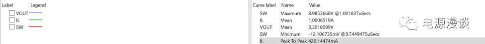 我們將負載電流改為100mA,進行時域仿真,此時根據(jù)電感電流p-p值可知已經(jīng)進入DCM模式,從節(jié)點電壓及電感電流波形上也可以看出,從測量數(shù)據(jù)來看,輸出電壓還是3.3V,基本的閉環(huán)調(diào)整特性還可以。