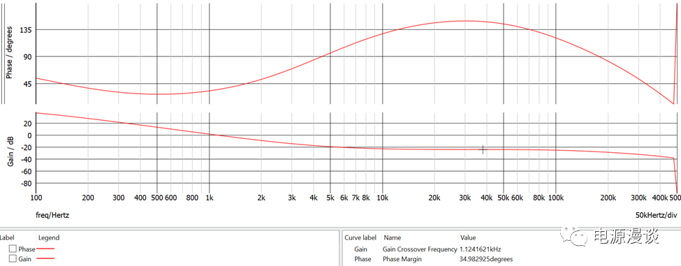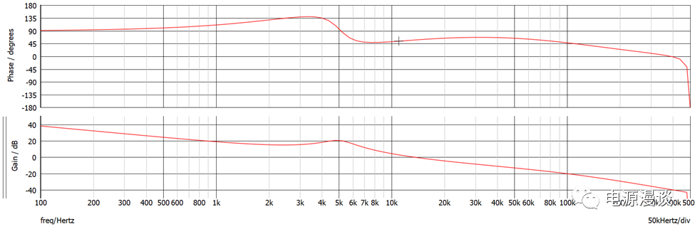 根據(jù)圖2所示的開環(huán)增益特性組成的各個環(huán)節(jié),考慮到PWM環(huán)節(jié)的增益為1,則總的增益由補償器和功率級增益組成,以此作為整個環(huán)路的開環(huán)增益?zhèn)鬟f函數(shù),我們將其Bode圖畫出來即可分析其環(huán)路特性。